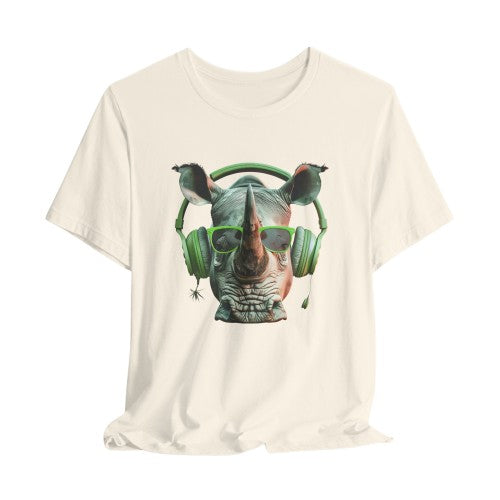 This battle-worn rhino rocks a mint-green headset and matching shades, blending raw power with laid-back vibes. Subtle cannabis iconography hints at a rebellious calm beneath the surface.