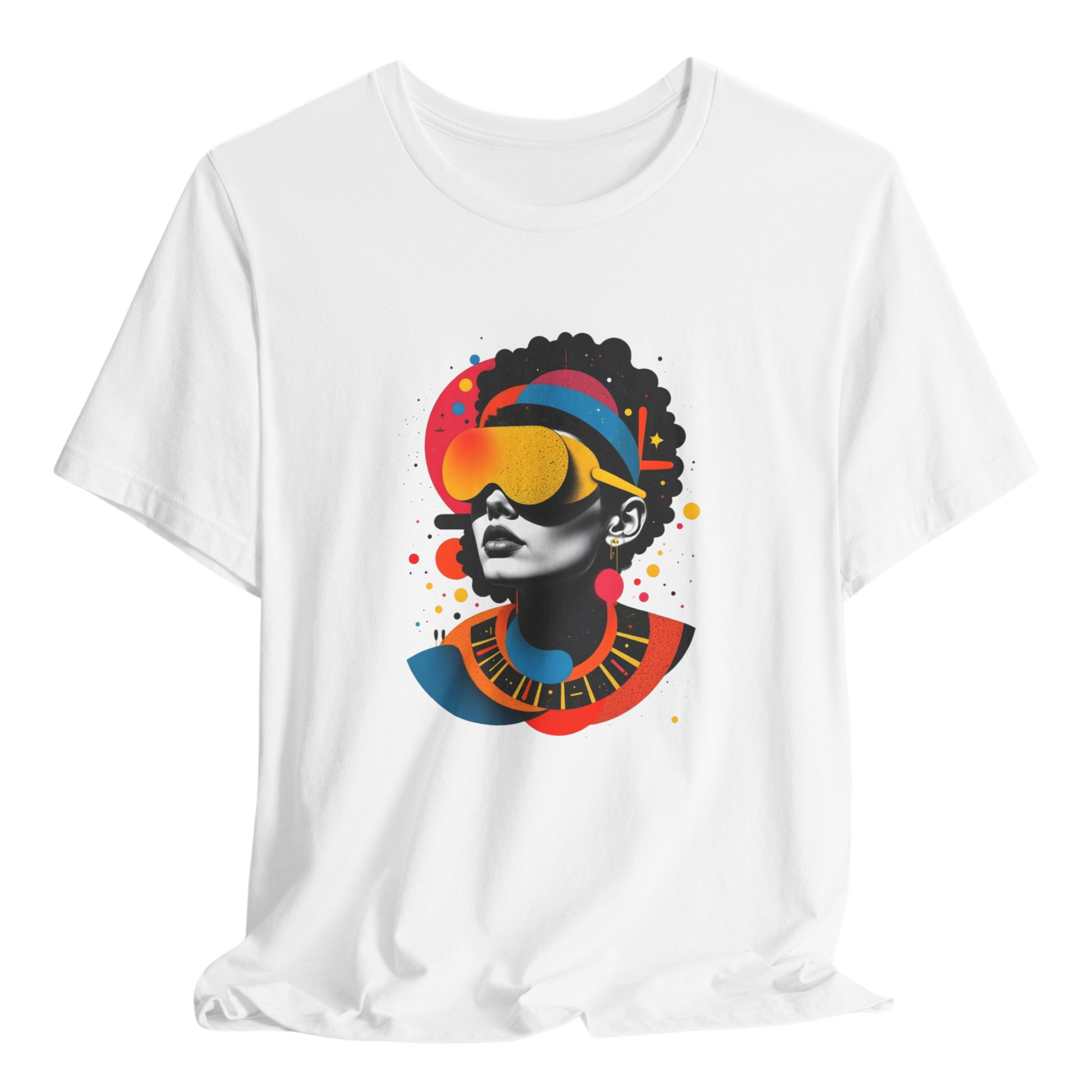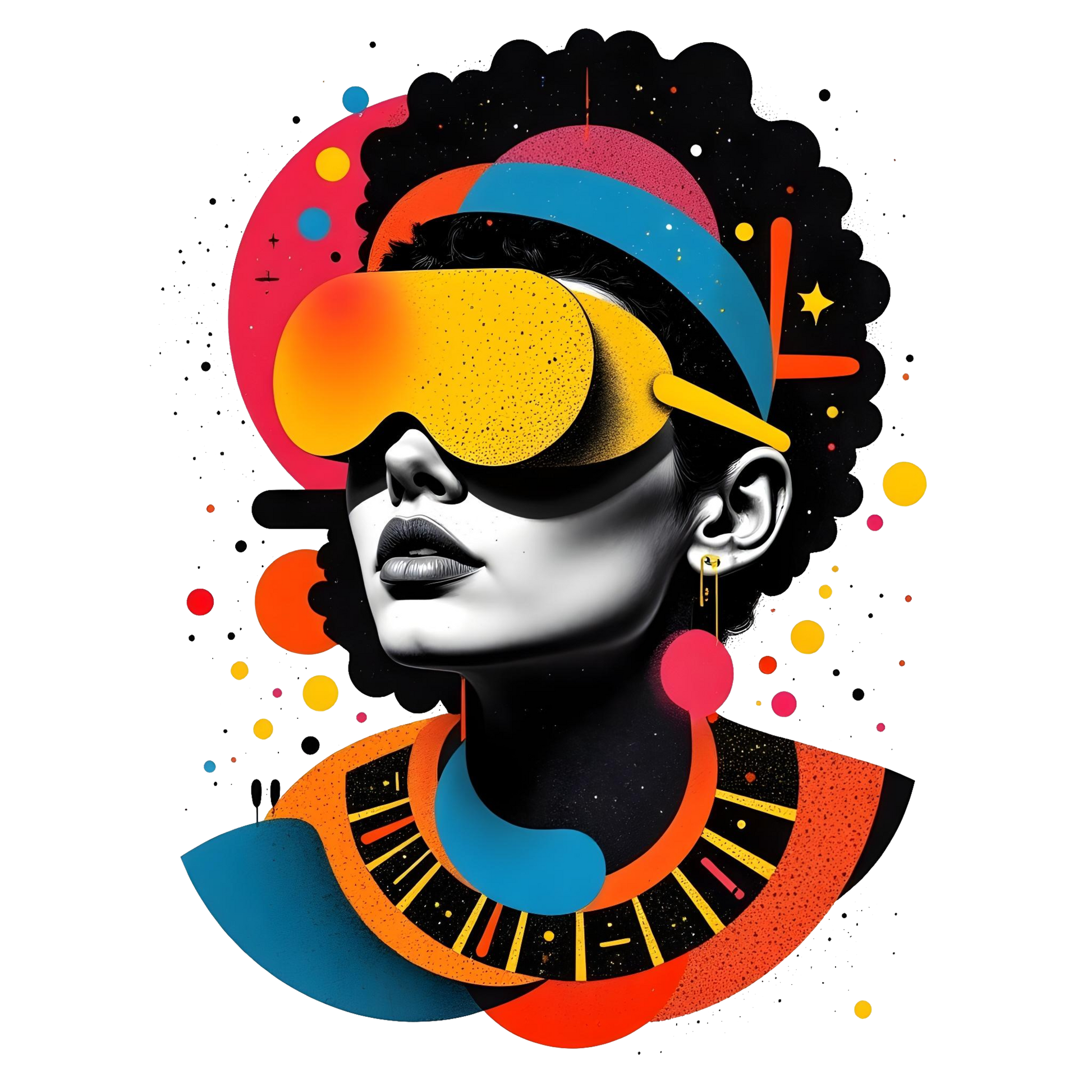 Monochrome serenity meets riot‑mode color as a visor of molten gold ignites her gaze and afro halo. Coded glyphs and splash‑paint orbs spin around her neck like a digital crown, fusing Afro‑futurism with street‑pop swagger.
