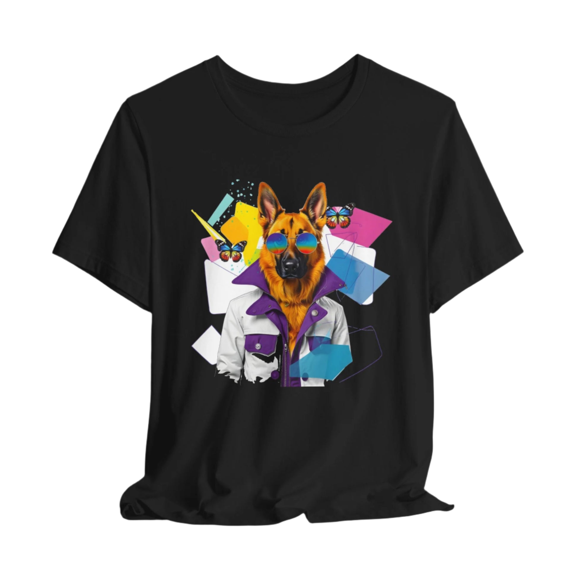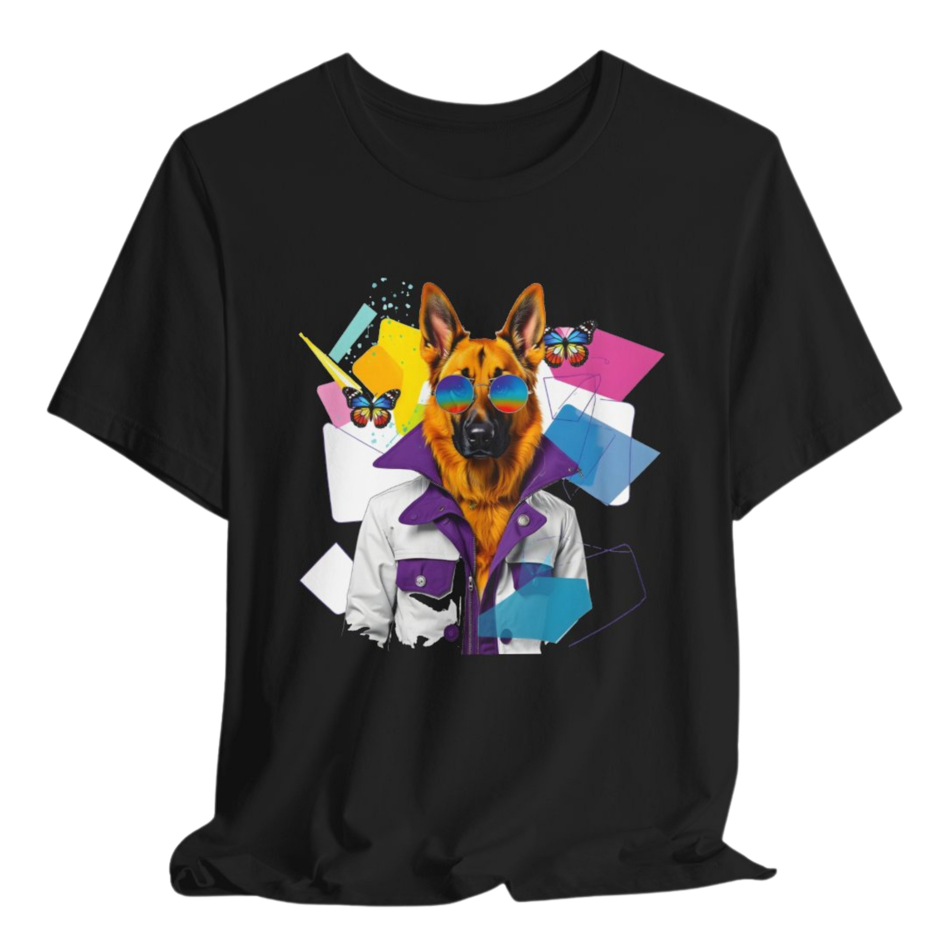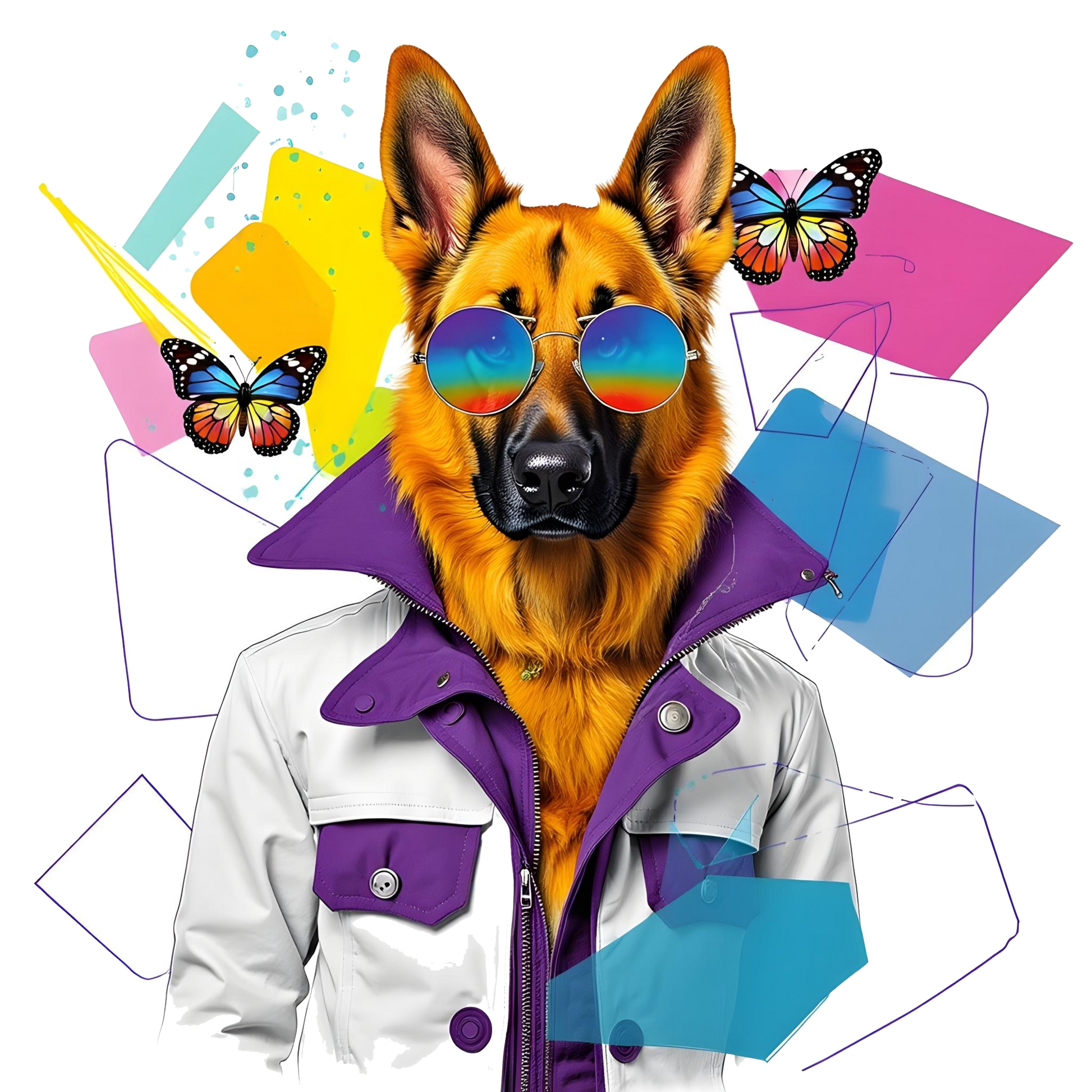 Sleek midnight shepherd in jet‑black trench and ultraviolet collar stares through dual‑tone neon lenses.