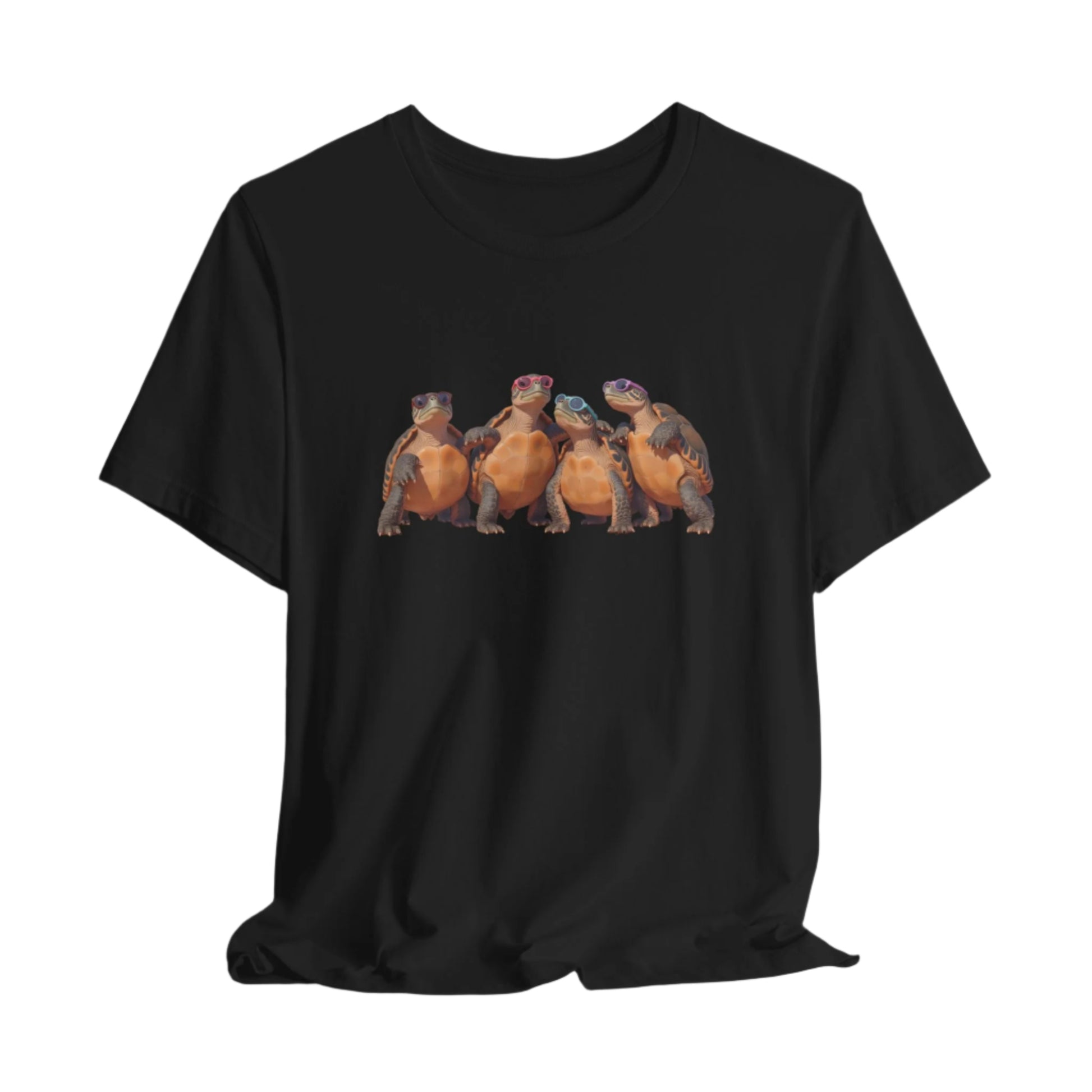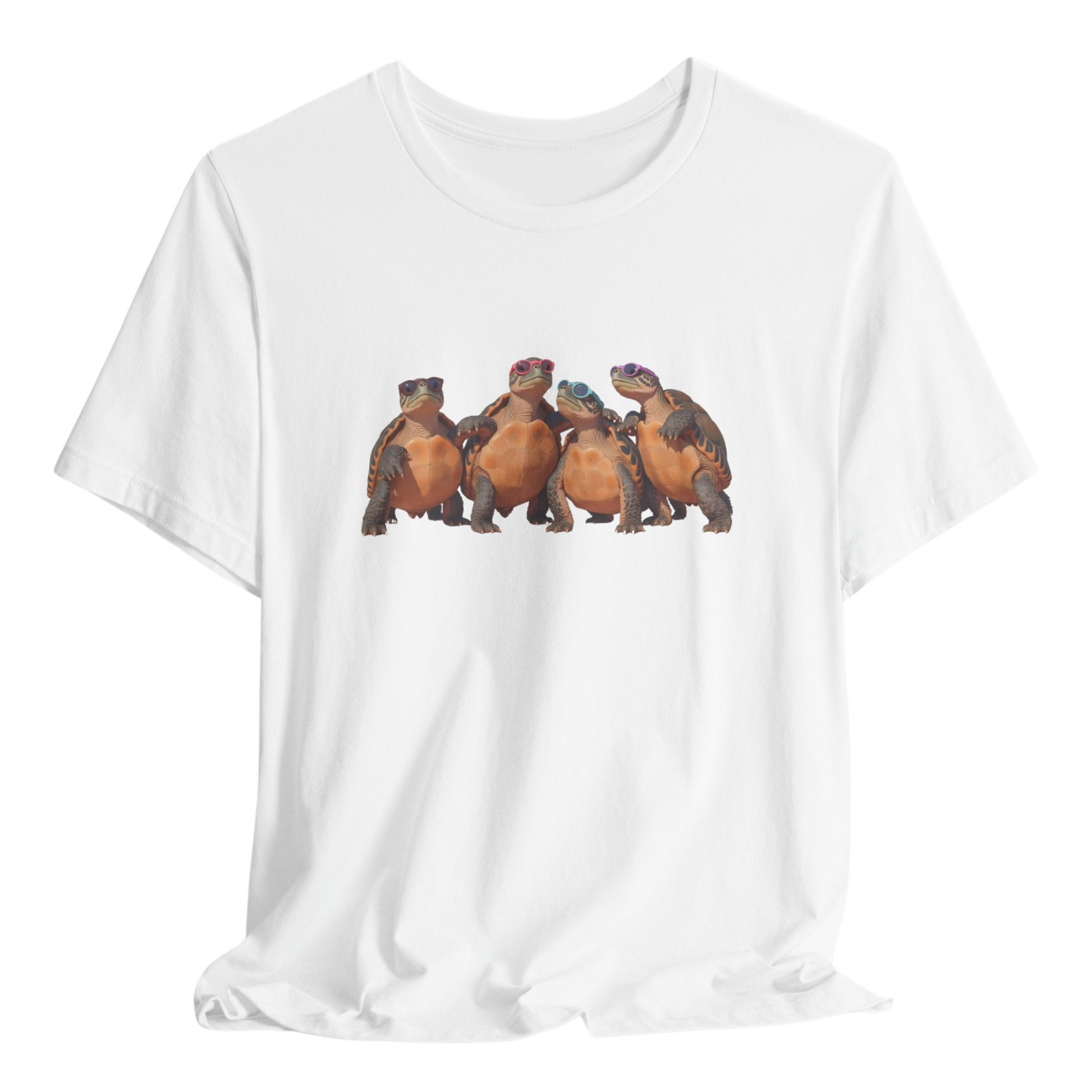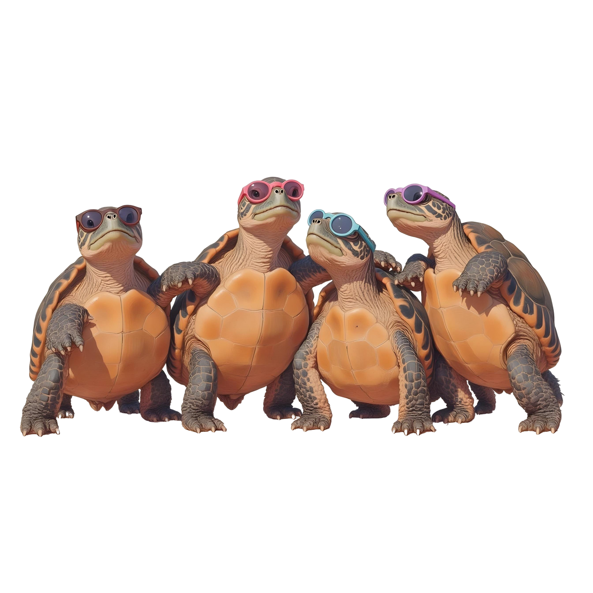 A squad of turtles redefining slow motion cool, rolling deep in pastel shades and zero hurry.