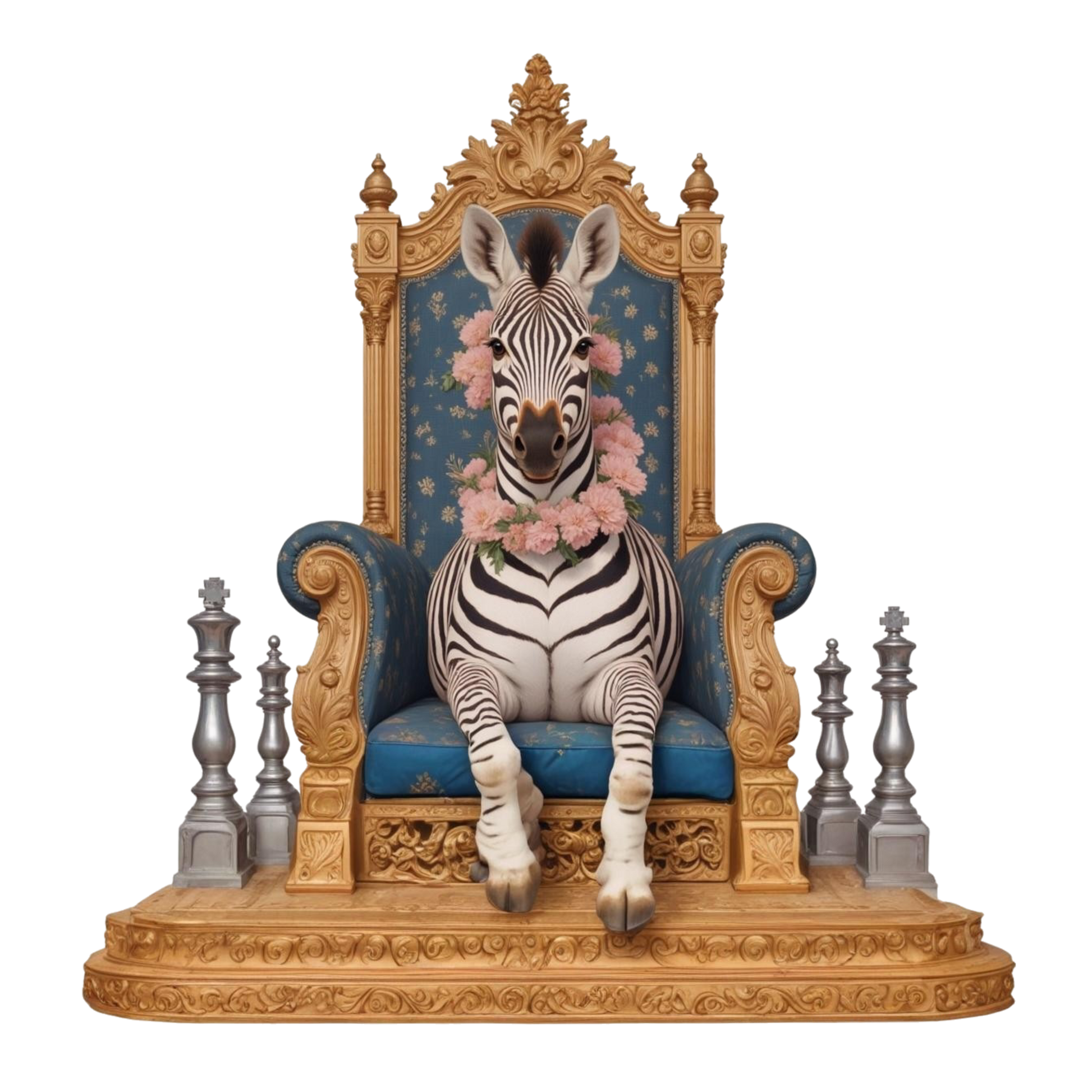 A zebra reigns on a royal seat, wrapped in flowers, unfazed by the chessboard at its feet.